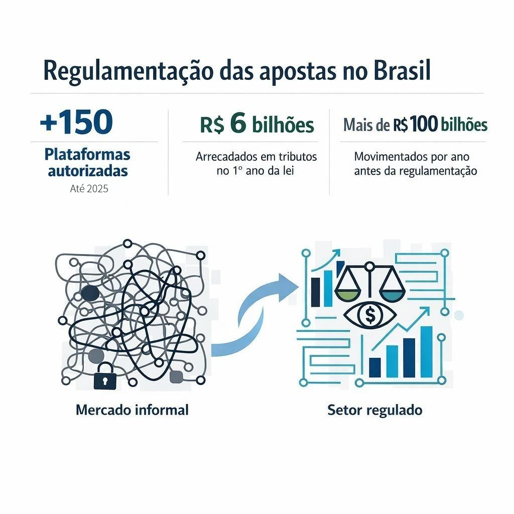 Em primeiro lugar, dados do Ministério da Fazenda indicam que mais de 150 plataformas foram autorizadas a operar até o fim de 2025. Enquanto isso, a estimativa oficial de arrecadação chegou a até R$ 6 bilhões em tributos no primeiro ano de vigência da lei. Antes da regulamentação, o próprio governo estimava que o mercado já movimentava mais de R$ 100 bilhões anuais, sem mecanismos efetivos de controle ou fiscalização.